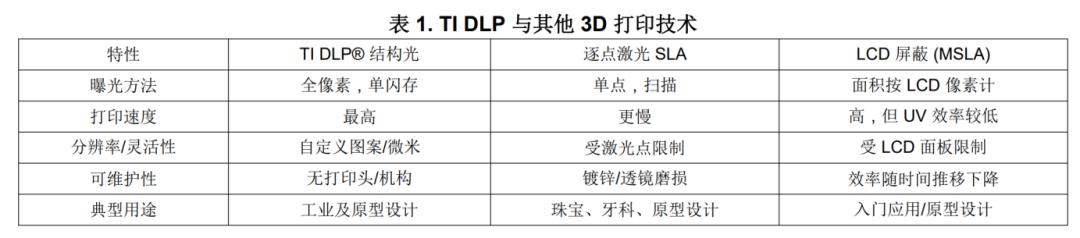 除了驱动,TI的DLP在3D打印领域也是不可不提的芯片技术。DLP技术在3D打印领域有着广泛的应用场景,包括快速原型设计、适用于工具和铸造的模具制造,以及直接进行零件制造等,能够满足不同行业的多样化需求。