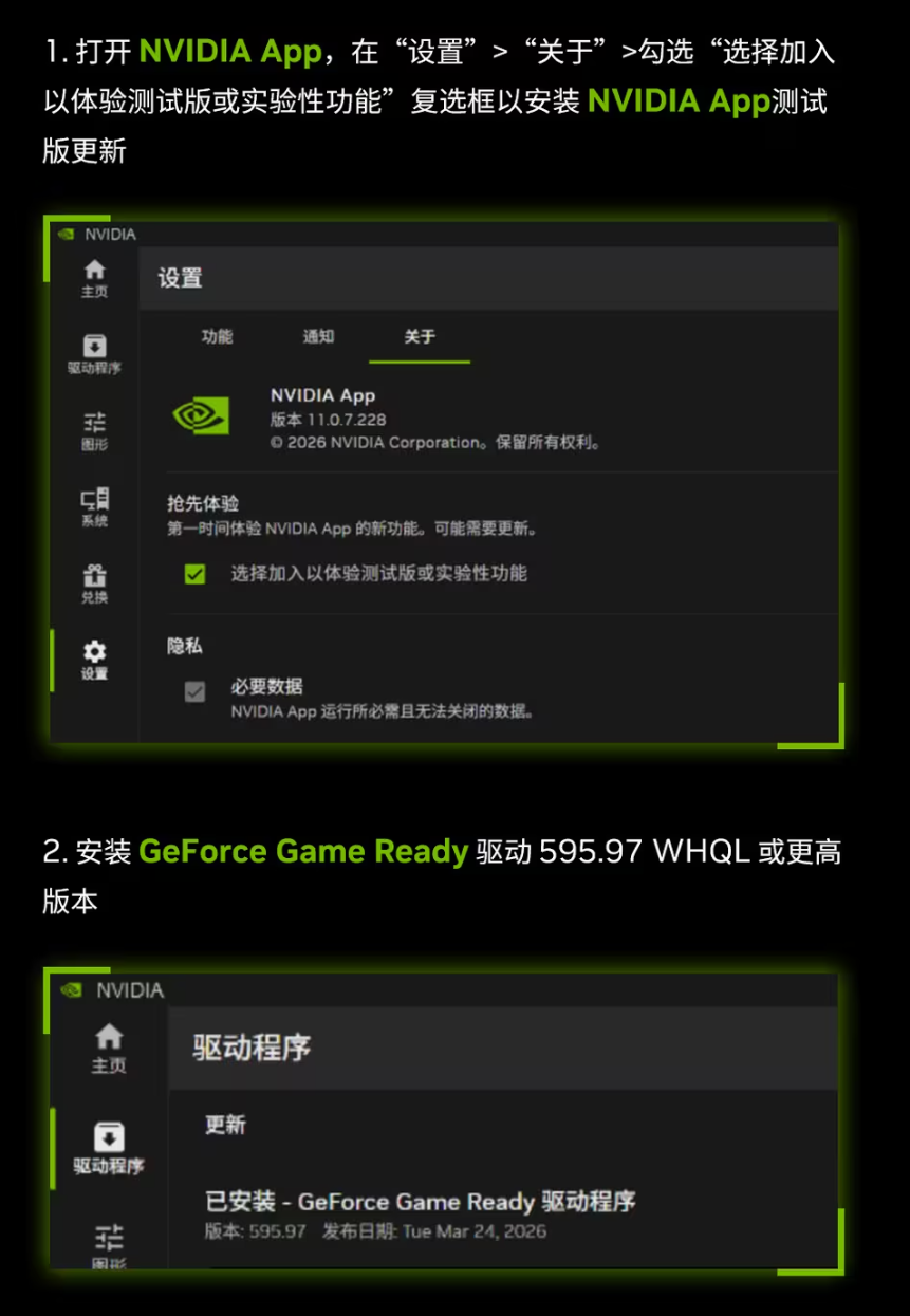 安装 GeForce Game Ready 驱动 595.97 WHQL 或更高版本