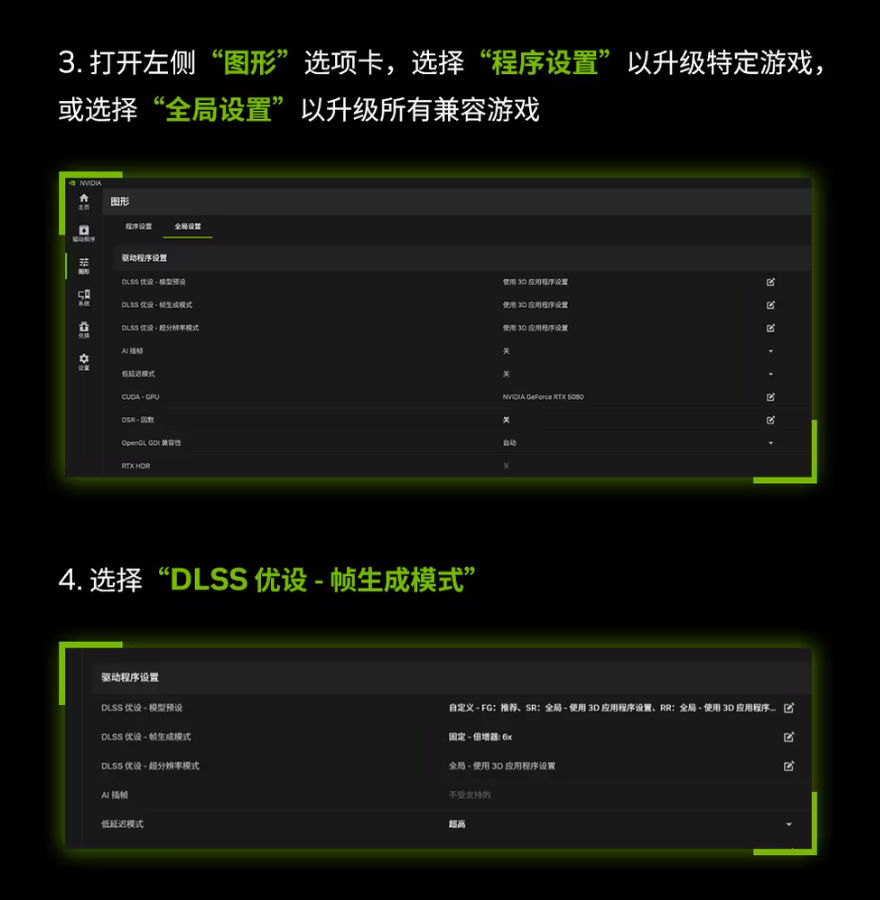 打开左侧“图形”选项卡,选择“程序设置”以升级特定游戏,或选择“全局设置”以升级所有兼容游戏