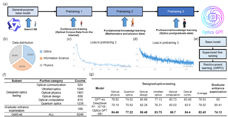 为解决上述问题,研究团队提出了Optics GPT,首次在通用基座模型基础上,通过三阶段渐进式认知训练,将光学知识深度内嵌于模型之中。为系统评估模型性能,团队同步构建了首个面向光学领域的综合性评测基准OptiEval。在测试中,Optics GPT(8B)在专业测试上取得了82.45分,超越GPT-4o(76.53)与DeepSeek-R1(671B)(78.52);在研究生入学考试中,以74.12分同样领先。这一结果表明:结构化、渐进式的领域知识注入,比单纯扩大参数规模更能带来本质性的专业能力提升,同时8B参数规模也使其具备了本地部署、安全可控的实用价值。