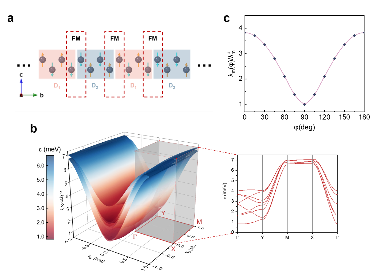 图1. CrOCl 的磁结构以及磁子能带特征。(a) CrOCl原子级阻挫的周期性条纹结构。(b) CrOCl的磁子色散关系,沿着 a 轴高度色散,沿着 b 轴为平带。(c)利用CrOCl的磁子色散关系计算得到的沿着不同的磁子衰减长度(除以 b 轴的衰减长度)