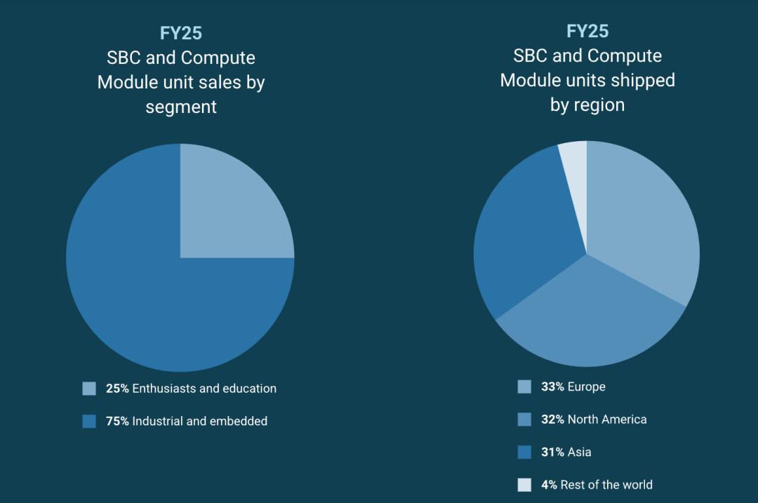 目前,树莓派约70%的销售额来自工业和嵌入式领域。根据其2025财年财报披露,SBC和计算模块的销量中,约75%来自工业与嵌入式客户,而传统的极客与教育市场占比已下降至25%。