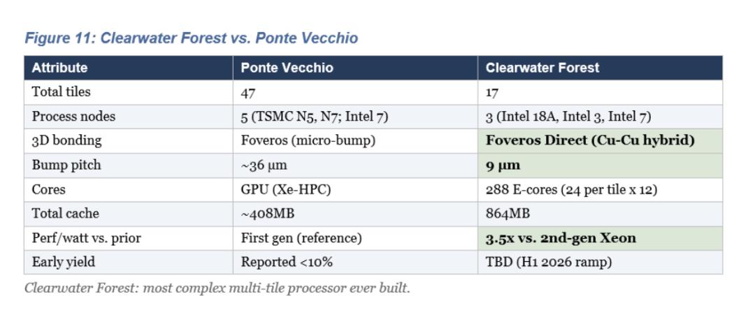 Foveros Direct (预计2026年上半年在Clearwater Forest工厂生产)实现了代际飞跃:采用铜对铜混合键合技术,间距为9微米,互连密度超过12,000个/平方毫米,功耗低于0.05皮焦/比特。第二代产品目标是在2027-2028年左右实现3微米间距(约111,000个/平方毫米)。英特尔声称,其流体自对准贴装技术可将吞吐量提升10倍。