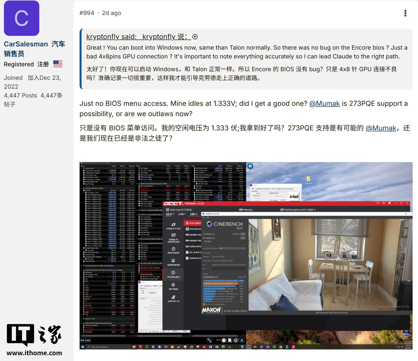IT之家曾于 3 月报道,网友 kryptonfly 借助 AI 大模型 Claude,成功编写出定制 BIOS,在华硕 Z790 消费级主板上,成功点亮酷睿 9 273PQE 处理器,但无法进入系统。