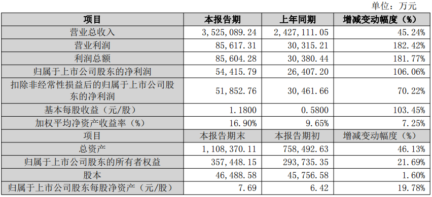 财务状况方面,报告期末公司总资产为110.84亿元,较期初增长46.13%;归属于上市公司股东的所有者权益为35.74亿元,增长21.69%。