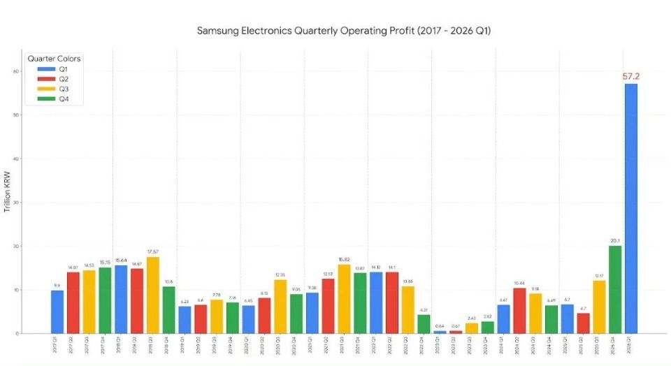 这一盈利数据不仅刷新了三星电子单季盈利纪录,更是一举超越其2025年全年43.6万亿韩元的营业利润总和。