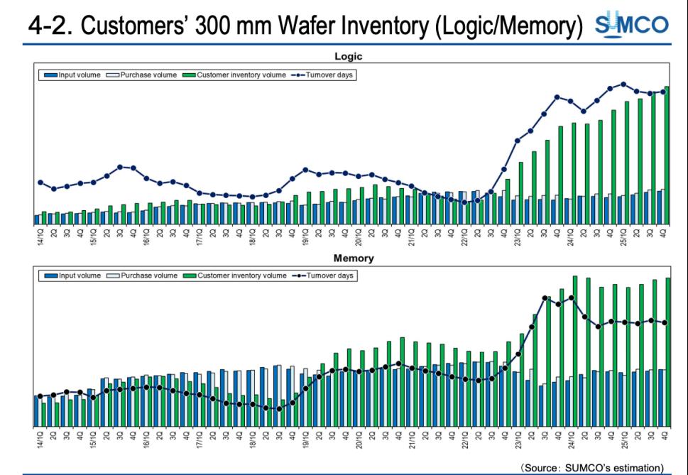逻辑和存储厂商300mm硅片的存货情况(图源:SUMCO 2025年财报)