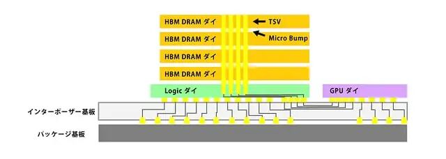具体而言,在3D堆叠式DRAM中,多个芯片堆叠在一起,每一层DRAM芯片都被减薄到极薄的程度,信号通过数千个穿透芯片的TSV(硅通孔)传输到上下两层芯片(。这使得总线宽度可以达到1024位甚至更高。考虑到传统的通用内存(例如DDR5)以几十位为单位输出数据,其并行处理能力是压倒性的。此外,在与GPU和其他设备结合使用的HBM中,采用了2.5D安装配置,其中DRAM通过称为硅中介层的中间基板放置在靠近处理器芯片的位置。