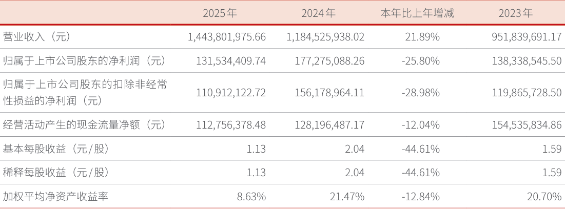 尽管营收实现较快增长,公司2025年归属于上市公司股东的净利润为1.32亿元,同比下降25.8%。扣除非经常性损益后的净利润为1.11亿元,同比下降28.98%。
