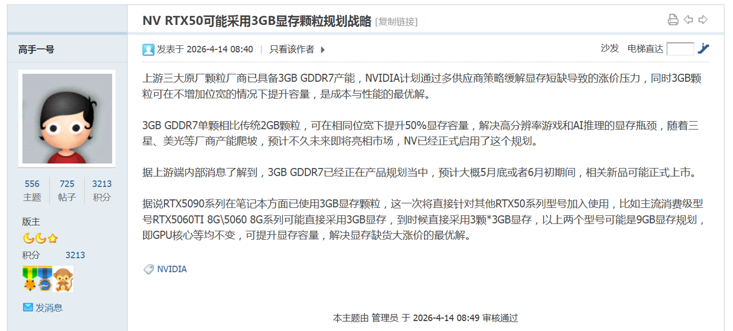 IT之家 4 月 15 日消息,网友“高手一号”昨日(4 月 14 日)在博板堂发帖,称英伟达计划在 2026 年 5 月末至 6 月初期间,推出 9GB 显存版本 GeForce RTX 5060 和 RTX 5060 Ti 显卡。