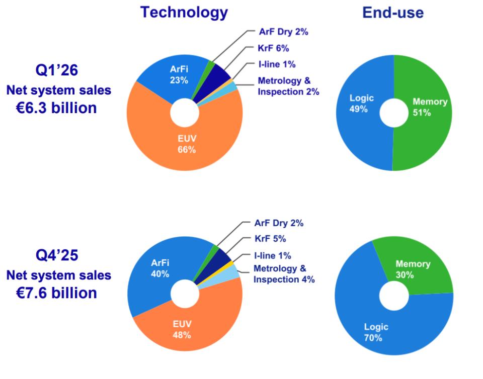 ASML在财报中披露,2025年第四季度,逻辑和存储客户的订单比例为70%、30%,到今年第一季度,两类客户的订单比例变成了49%、51%。