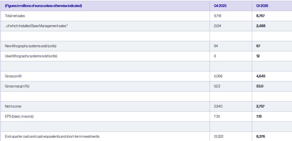 4月15日,光刻机巨头ASML发布2026年第一季度财报。财报显示,ASML当季总净销售额88亿欧元,净利润28亿欧元,每股基本收益7.15欧元。