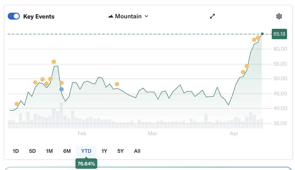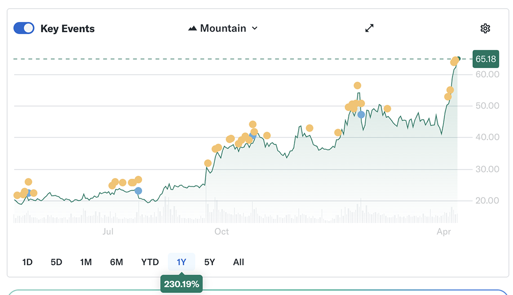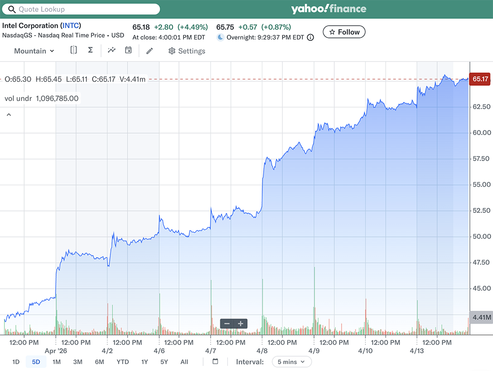 芯东西4月14日消息,短短9个交易日,英特尔股价飙升58%,市值增长超过1200亿美元(约合人民币8184亿元),成为标普500指数中最热门的股票之一。