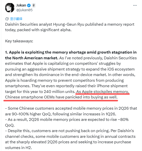 大信证券的分析进一步指出,苹果对移动DRAM的集中采购已经在一定程度上引发中国原始设备制造商(OEM)的恐慌,这些厂商也开始加速囤积关键内存资源,从而进一步加剧市场短缺。