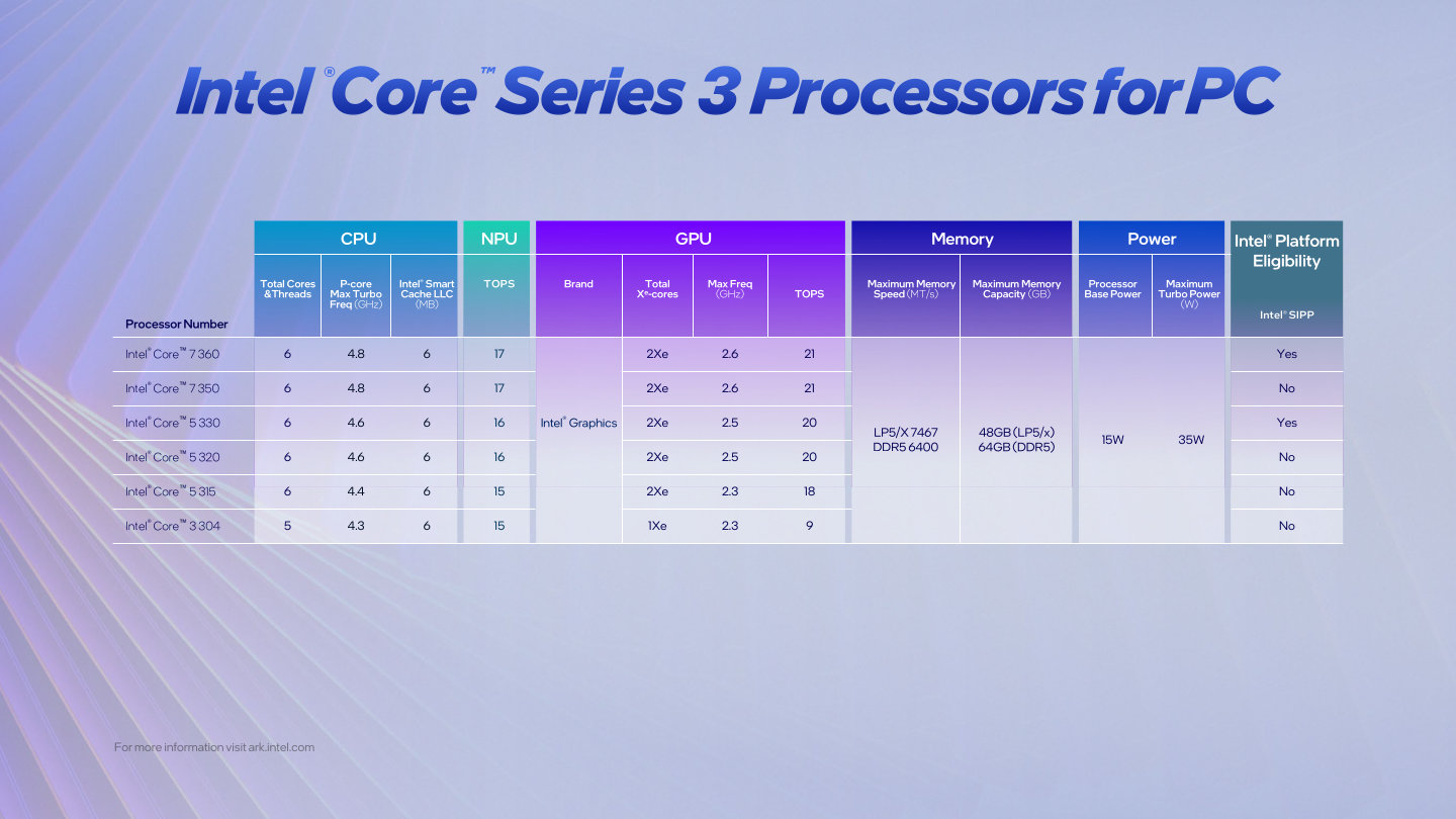 酷睿 300 采用 Intel 18A 制程工艺,规格至高为 2P + 0E + 4LP-E + 2Xe + 17TOPS,支持 LPDDR5x-7467 / DDR5-6400 内存,提供 6 条 PCIe Gen4 通道,可扩展出 2 个雷电 4 接口,兼容 Wi-Fi 7、蓝牙 6.0 规范。