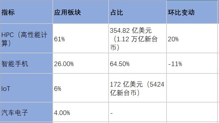 HPC(高性能计算)平台营收占比首次突破60%,达到61%,环比增长20%。智能手机环比下降11%至26%,IoT占6%,汽车电子仅占4%。