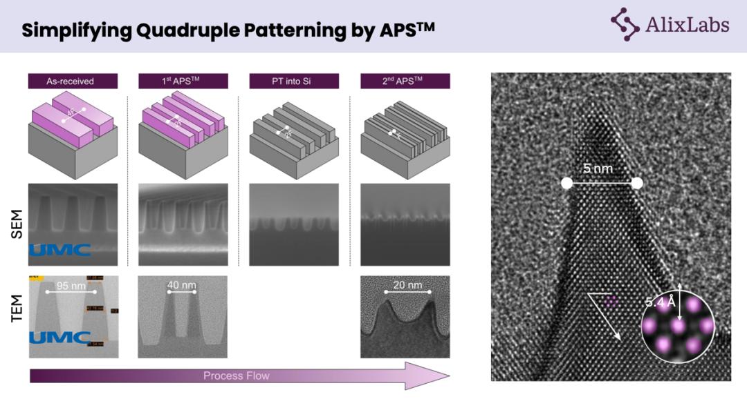 2025年,AlixLabs与联电(UMC)合作进行晶圆级演示,使用浸没式氟化氩(ArFi)光刻技术,成功实现了 19nm 的半节距(Half Pitch)。