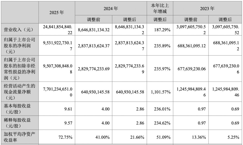 C114讯 4月24日消息(水易)昨日,新易盛公布2025年业绩。报告期内,新易盛实现营收248.42亿元,同比增长187.29%;归属于母公司股东的净利润95.32亿元,同比增长235.89%;扣非净利润95.07亿元,同比增长235.97%。