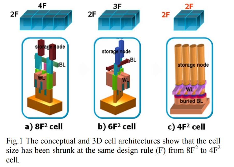 IT之家注:4F Square 是一种先进的 DRAM 单元结构设计,其中“F”代表光刻工艺的最小特征尺寸。该结构将每个存储单元置于 2F×2F 的面积内,相比传统的 6F Square 设计,能在相同的芯片面积内容纳更多单元,从而显著提升存储密度,是实现 DRAM 高密度微缩的关键技术路径。