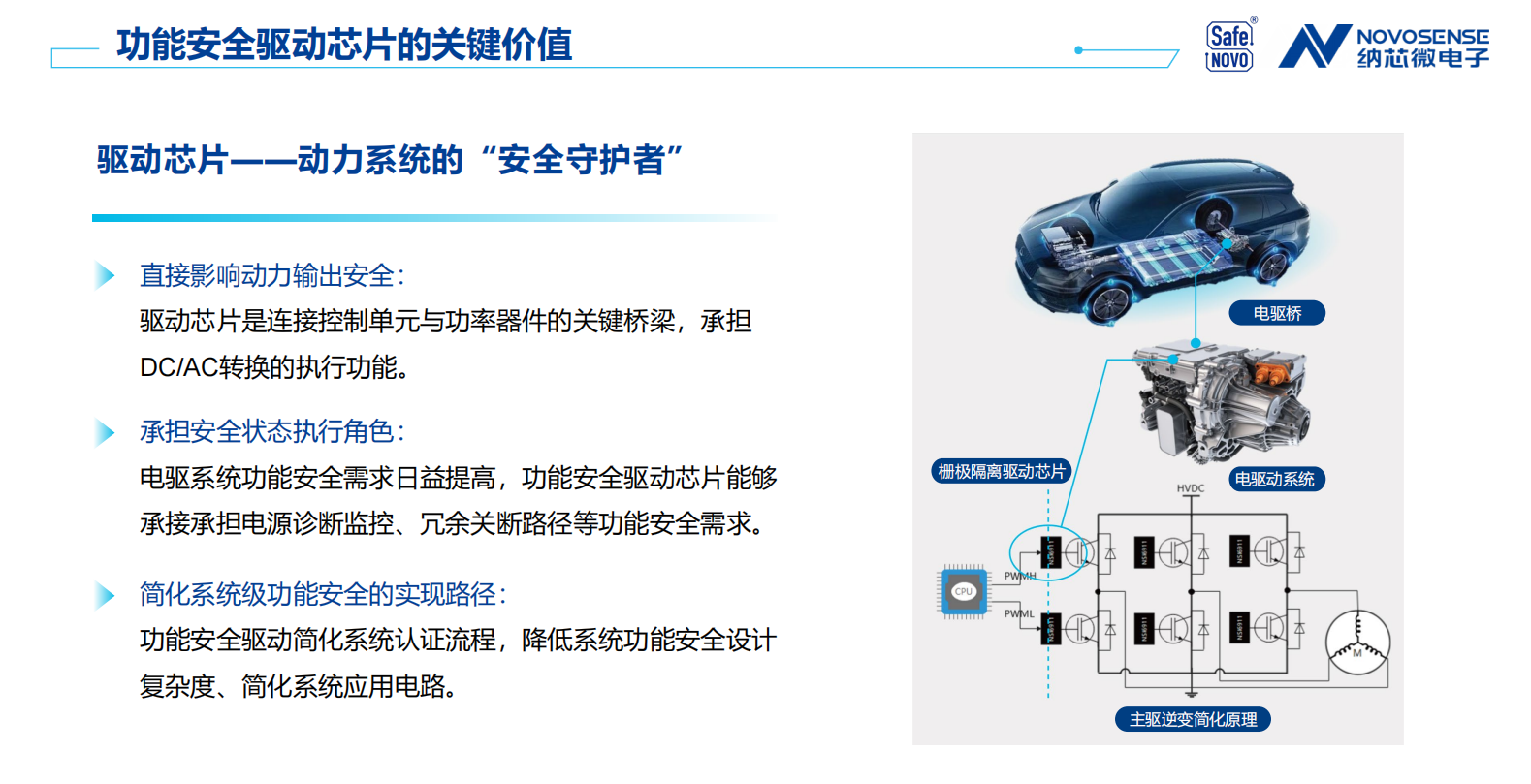 随着汽车产业向电动化、智能化、网联化加速转型,车辆的电子系统复杂度呈指数级提升,安全风险也随之加剧。功能安全驱动芯片作为汽车动力系统的核心器件,直接关系到整车行驶安全,其国产化进程也成为行业关注的焦点。近日,纳芯微推出国内首款基于全国产供应链、通过TÜV莱茵认证并达到ISO 26262 ASIL D等级的隔离栅极驱动NSI6911F系列,标志着我国在高等级汽车功能安全驱动芯片领域实现重大突破。