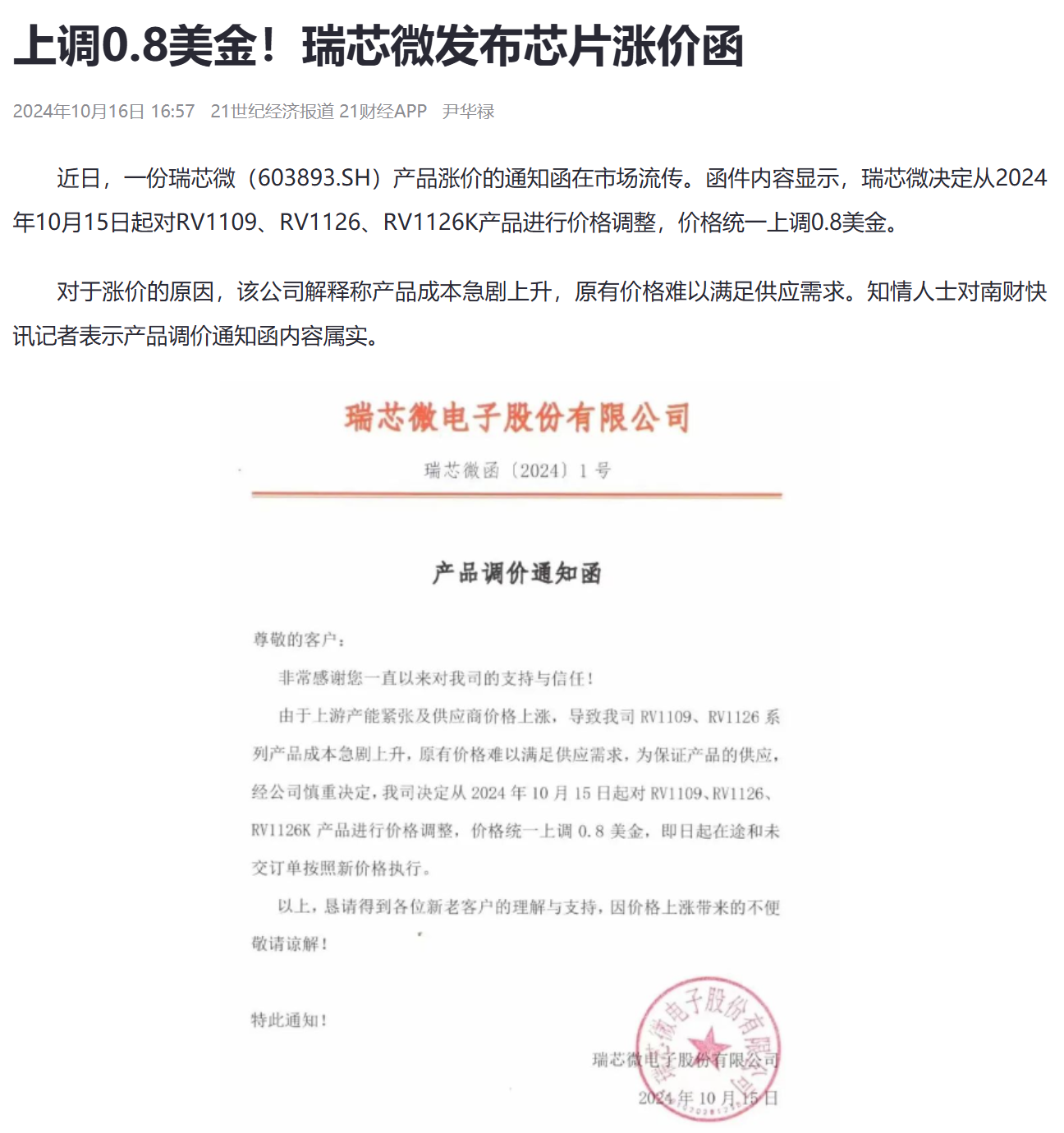 函件内容显示,瑞芯微决定从 2024 年 10 月 15 日起对 RV1109、RV1126、RV1126K 产品进行价格调整,价格统一上调 0.8 美元(IT之家备注:当前约 5.7 元人民币)。对于涨价的原因,该公司解释称产品成本急剧上升,原有价格难以满足供应需求。