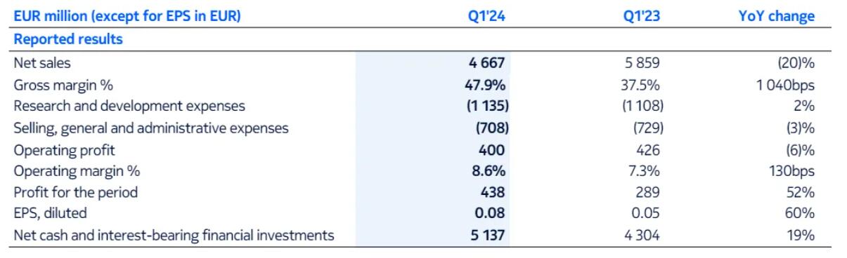 Jimmy Yu对这一消息的看法评价,对诺基亚而言无疑是个好兆头,该公司最近的收益报告可谓血雨腥风:诺基亚在2024年第一季度的净销售额同比下降了20%,为46.7亿欧元(合49.5亿美元),而去年同期为58.6亿欧元(合62.4亿美元)。