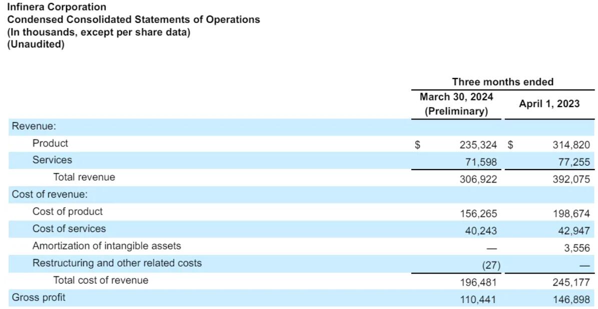 对比之下,Infinera在2023年实现营收16.14亿美元,同比增长2.60%;净亏损2520万美元,较2022年少亏损66.84%。以下是其2024年一季度财报状况: