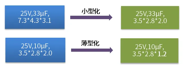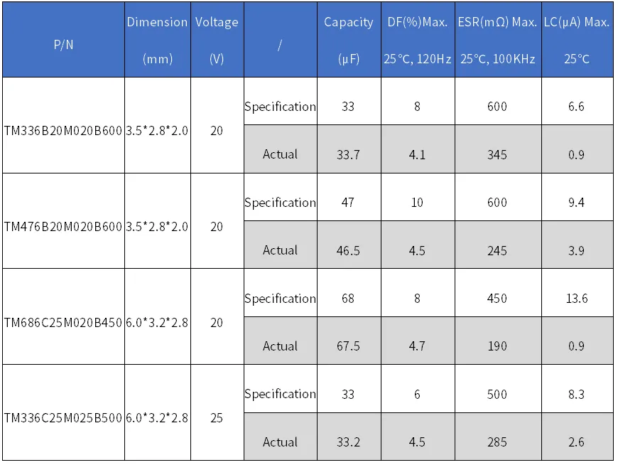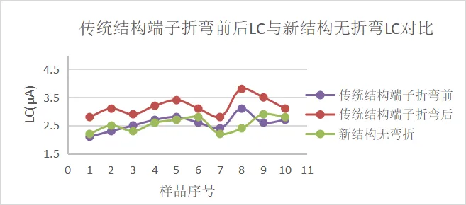 传统Frame结构折弯前后LC与新结构LC对比(以25V, 33μF, C size为例):传统结构端子折弯前后,LC从2.58μA变化到3.17μA,增大了23%;而新结构钽电容为底部电极,无需折弯,LC无变化。
