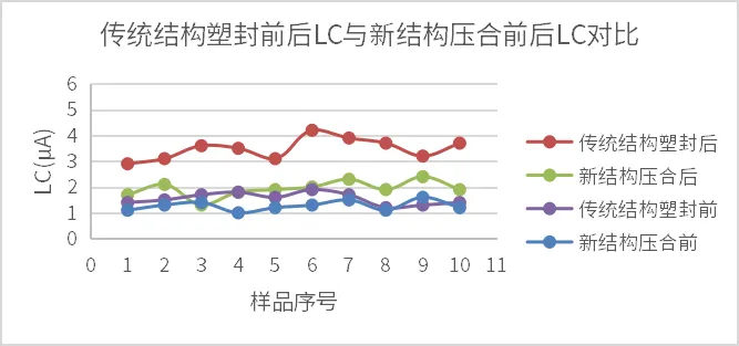 传统引线框结构塑封前后LC与新结构压合前后LC对比 (以25V, 33μF, C size为例):传统引线框结构塑封前后,LC从2.67μA变化到5.45μA,增大了104%;而新结构钽电容压合前后,LC从2.57μA变化到3.72μA,仅增大45%。