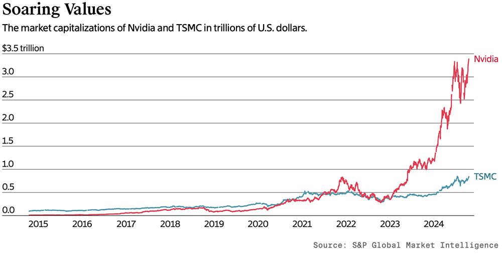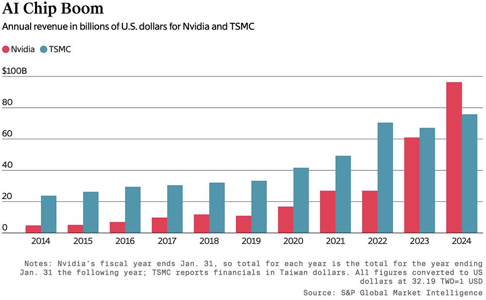2014~2024年英伟达和台积电年收入变化(图源:The Information)