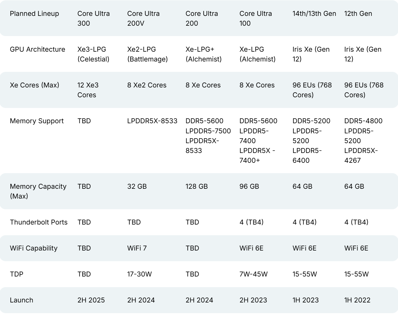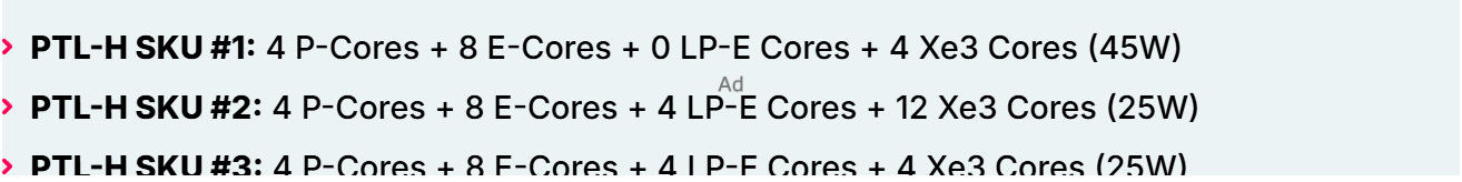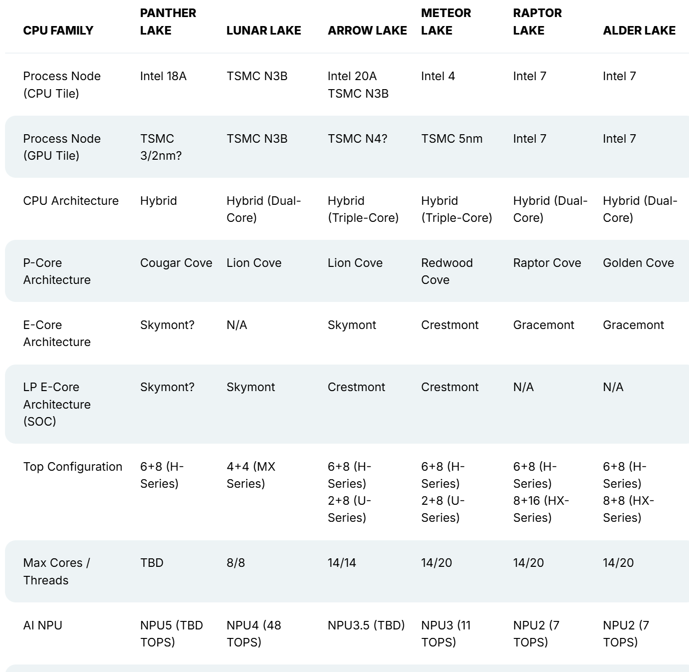 关于Panther Lake的简要介绍,“Core Ultra 300 ”SKU将采用Cougar Cove P-Cores和Skymont E-Cores,在板载iGPU方面,可能会采用Xe3形式的第三次重大Xe架构更新,代号为Celestial,是Battlemage的继任者。根据之前的传言,以下是Panther Lake可能采用的SoC: