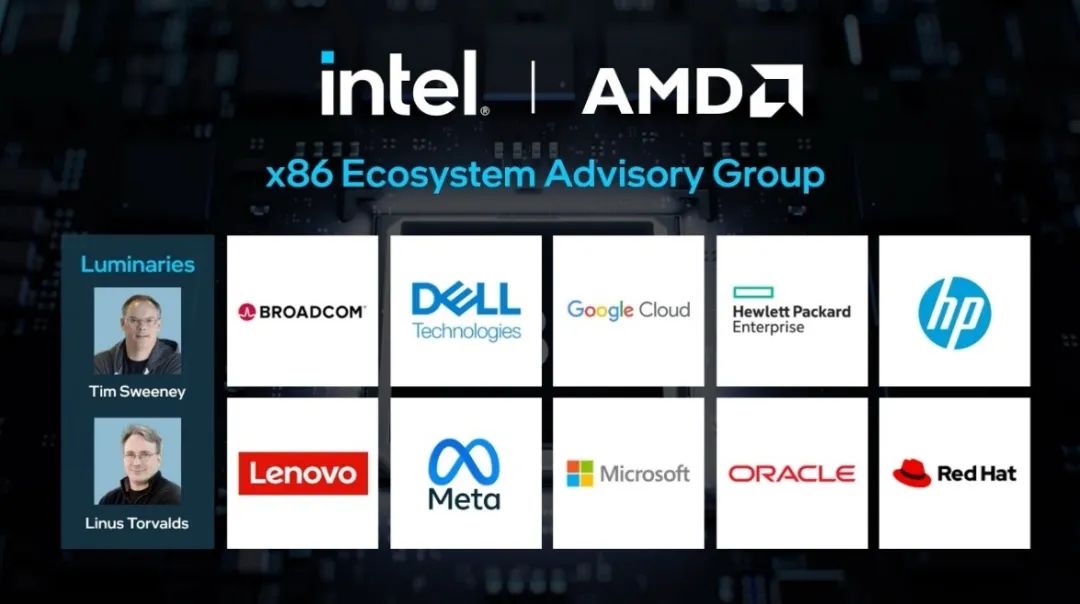 也就是在这场科技盛会之后,英特尔与AMD联合宣布共同成立“x86生态系统顾问小组”,小组其他成员包括博通、戴尔、谷歌惠普、联想、Meta、微软、甲骨文等十家行业内响当当的巨头。