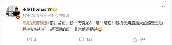 快科技10月17日消息,王腾发微博表示,高通骁龙8至尊版很快发布,新一代骁龙平台非常非常强,新机使用后最大的感受是功耗控制特别好,超预期的好,非常值得期待。