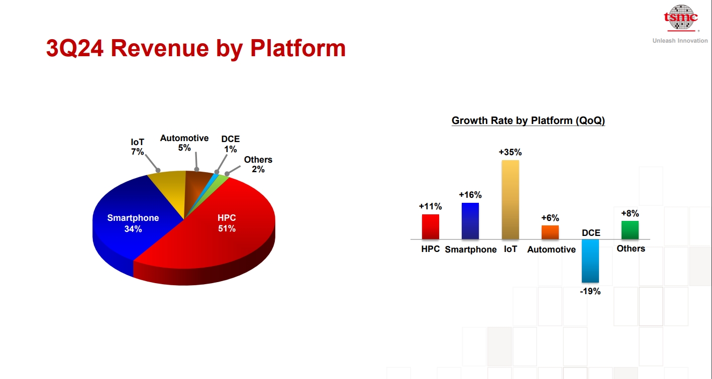 台积电统计,若以美元计算,2024年第三季度营收为235亿美元,较去年同期增加36.0%,较前一季增加12.9%。