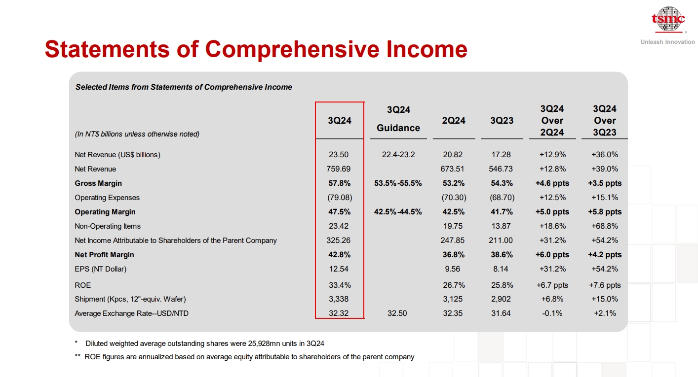 台积电指出,第三季度毛利率为57.8%,营业利润率为47.5%,净利润率为42.8%。