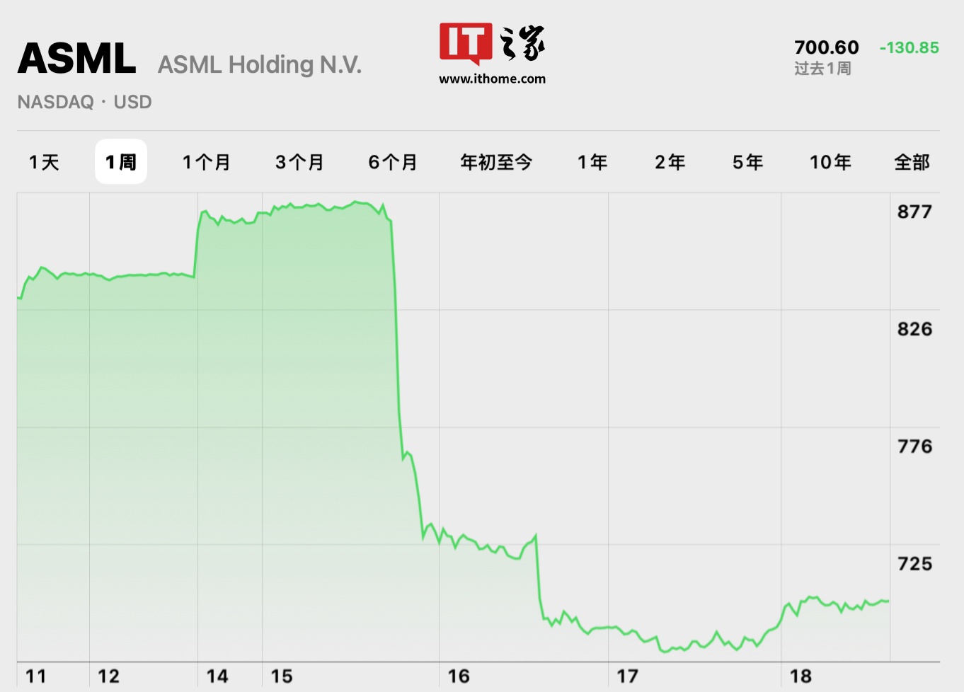 IT之家 10 月 18 日消息,荷兰光刻机巨头阿斯麦(ASML)因为提前泄露了财报数据,且显示业绩大幅下滑,导致股价暴跌,该公司在 10 月 15 日跌幅达 15.6%、16 日进一步下跌 5.1%,收盘报 633.9 欧元(当前约 4899 元人民币),目前阿斯麦市值已蒸发 600 多亿欧元,失去欧洲市值最高科技公司头衔,德国软件巨头思爱普市值暂居欧洲科技公司之首。