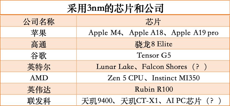 目前台积电3nm项目清单中包括Apple A18、Apple M4和用于iPhone的 A19芯片、高通即将推出的骁龙 8 Gen4 芯片、英特尔的新款 Lunar Lake和Arrow Lake CPU、AMD 的新款 Zen 5 CPU 和即将推出的Instinct MI350 系列 AI 加速器,以及NVIDIA的下一代 Rubin R100 AI GPU(将搭载未来一代 HBM4 内存)、联发科的新款Dimensity C-X1(汽车芯片)。