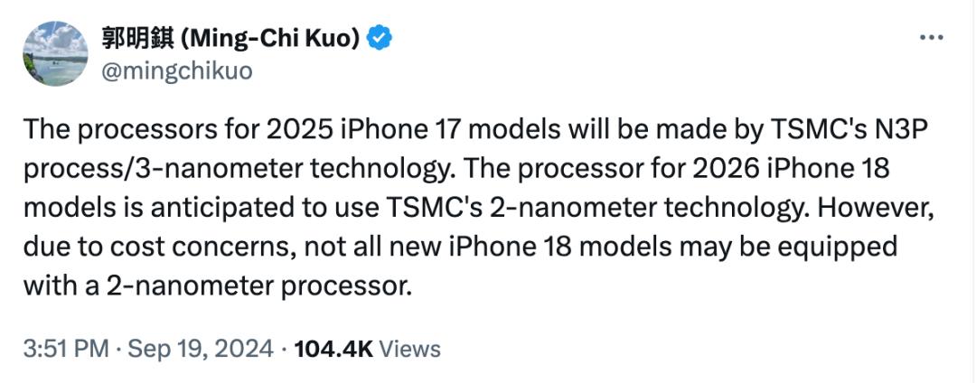 苹果自去年的A17 Pro芯片开始,就率先使用了3nm工艺。今年的A18和A18 Pro则更进一步,分别采用的是台积电N3E和N3P工艺。据天风国际分析师郭明錤的推文透露,苹果2025年iPhone 17的处理器A19 Pro芯片,将继续采用台积电的N3P工艺/3纳米技术制造。2026年iPhone 18型号的处理器预计将使用台积电的2纳米技术。然而,出于成本方面的考虑,并非所有新款iPhone 18都将配备2纳米处理器。