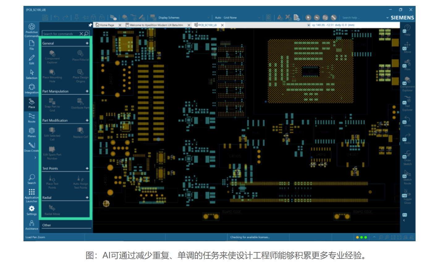 西门子EDA工具中的AI涵盖一系列相互协同的技术,它们使得客户能够打造出更好的芯片和电子系统。例如,设计电路板系统时,Xpedition、HyperLynx和PADS Pro能够借助即时机器学习模型,根据上一个指令来预测下一个指令。
