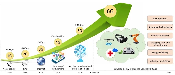 6G,即第六代移动通信标准,是移动通信技术的最新进展,继承并超越了第五代移动通信技术(5G)。6G不仅在通信速度和连接能力上有显著提升,还将在推动物联网(IoT)发展方面发挥关键作用。业界普遍认为,6G的通信能力将是5G的十倍以上,标志着从万物互联向“万物智联,数字孪生”的转变。