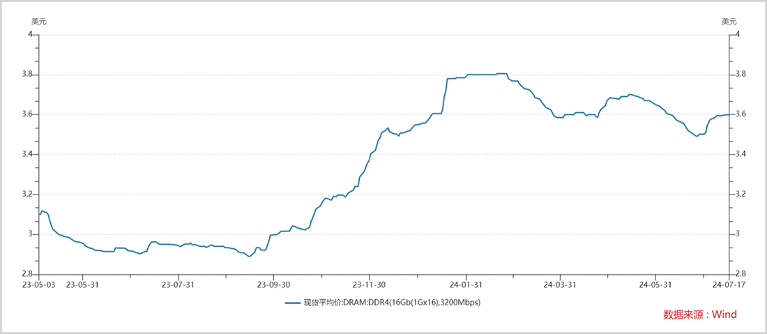 周期反转之下,存储芯片价格持续上涨。以DARM DDR4(16Gb)为例,价格从2023年9月低点的2.89美元上涨至如今的3.6美元,累计涨幅为25%。