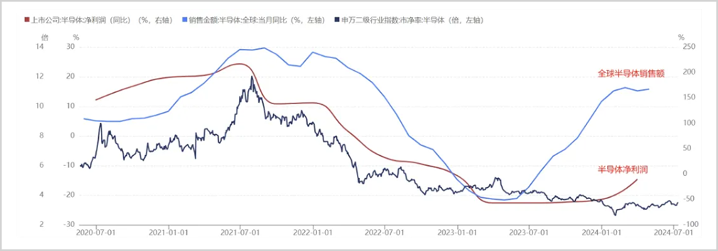 全球半导体市场正处在新一轮复苏周期中。销售收入拐点出现在2023年二季度,净利润表现更为滞后一些,拐点出现在2024年一季度。