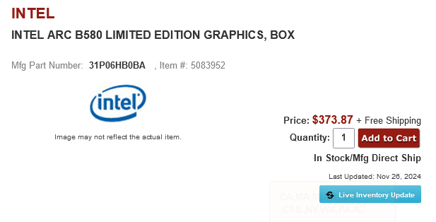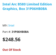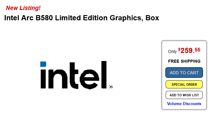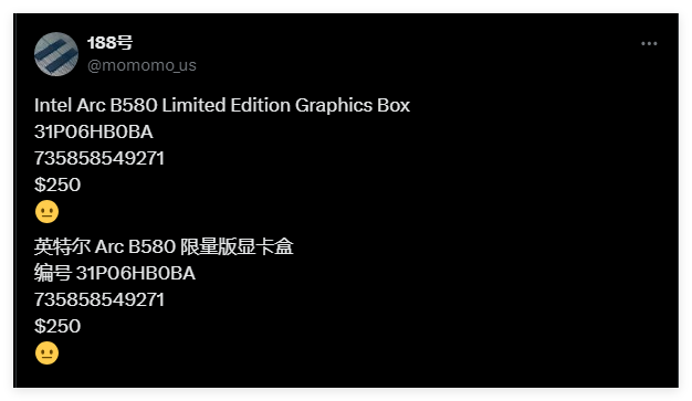 英特尔即将发布代号为Battlemage的第二代锐炫独立显卡,根据网友的爆料,被称为Intel Arc B580 Limited Edition Graphics Box的显卡,价格为250美元左右(约合1811元人民币)。Videocardz发掘确认,美国一家电子零售商在其网站上列出了英特尔Arc B580显卡,价格为250美元左右,但没有任何细节。