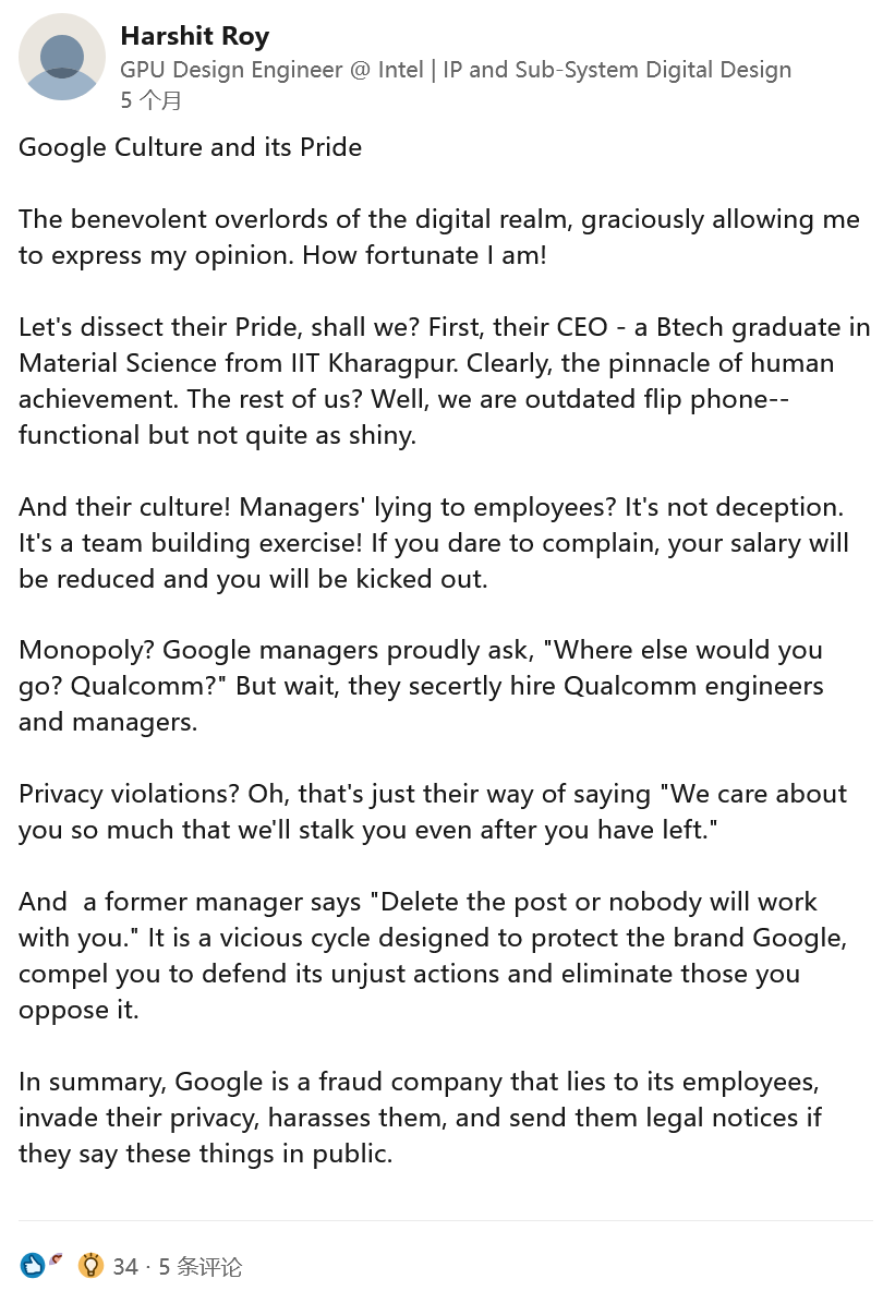 Google的一名前工程师据称发布了与 Pixel 芯片设计有关的机密,其中还包括威胁性评论,Google现在正在起诉他。印度半导体工程师哈希特-罗伊(Harshit Roy)于 2020 年大学毕业后开始在班加罗尔为Google工作。 他的职责是协助设计、开发和部署用于Google Pixel 系列产品(智能手机、平板电脑和可穿戴设备)的 SoC。