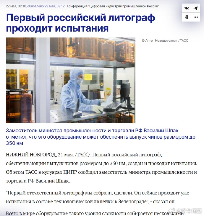 俄罗斯联邦工业和贸易部副部长瓦西里-什帕克指出,该设备可确保生产350nm的芯片。