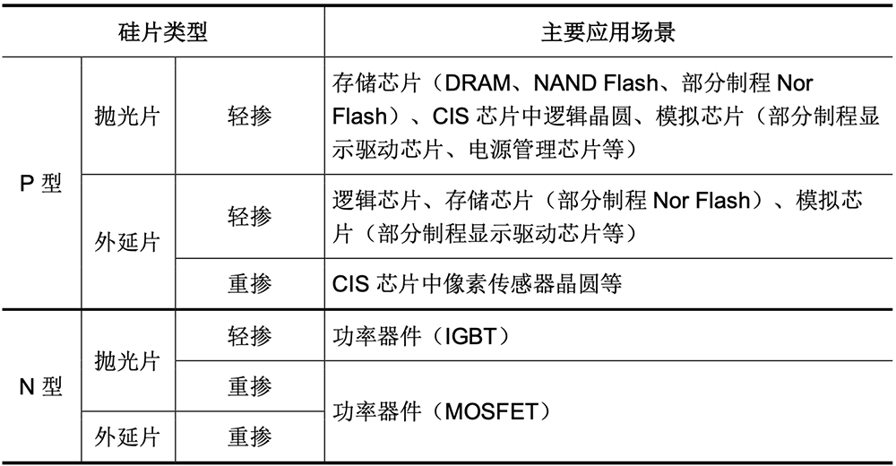 正片又可进一步细分为抛光片和外延片。抛光片主要用于DRAM、NAND Flash等存储芯片制造。外延片即在抛光片上利用化学气相沉积方法镀膜而成,主要用于 CPUGPU手机SoC嵌入式MCU为代表的逻辑芯片制造。