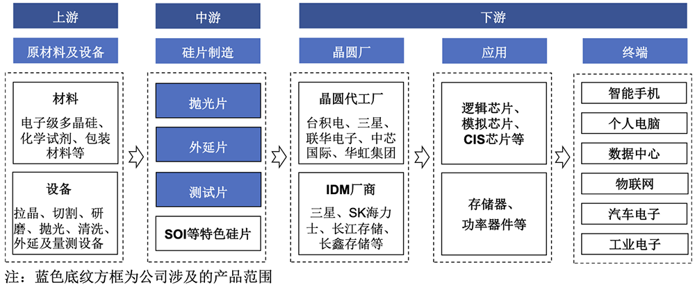 该公司以电子级多晶硅为原料,通过直拉法拉晶制成单晶硅棒,之后经过成型、抛光、清洗三道工序形成12英寸抛光片,部分产品再进行外延工序后形成12英寸外延片。