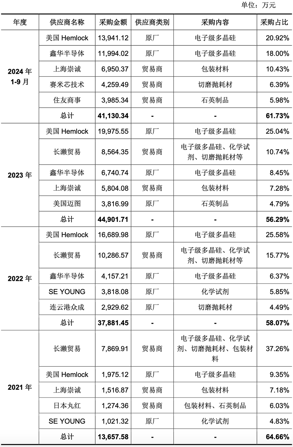 该公司已与美国Hemlock、日本德山、日本丸红、长濑贸易等行业内知名供应商建立了稳定的合作关系。对于采购占比最大的电子级多晶硅,全球技术成熟且具有一定产能规模的仅有4-5家企业,西安奕材已与部分原厂供应商签订长期协议保证稳定供应,并已量产导入国内厂商。