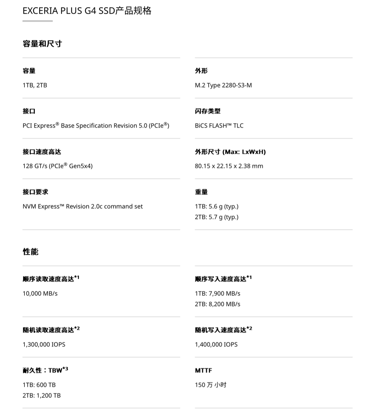 据介绍,Exceria Plus G4 顺序读取最高 10,000MB/s,顺序写入最高 8,200MB/s(1TB 版本为 7,900 MB/s)。两种型号的 4K 随机访问性能均为 130 万 IOPS 读取、140 万 IOPS 写入。