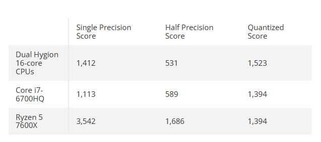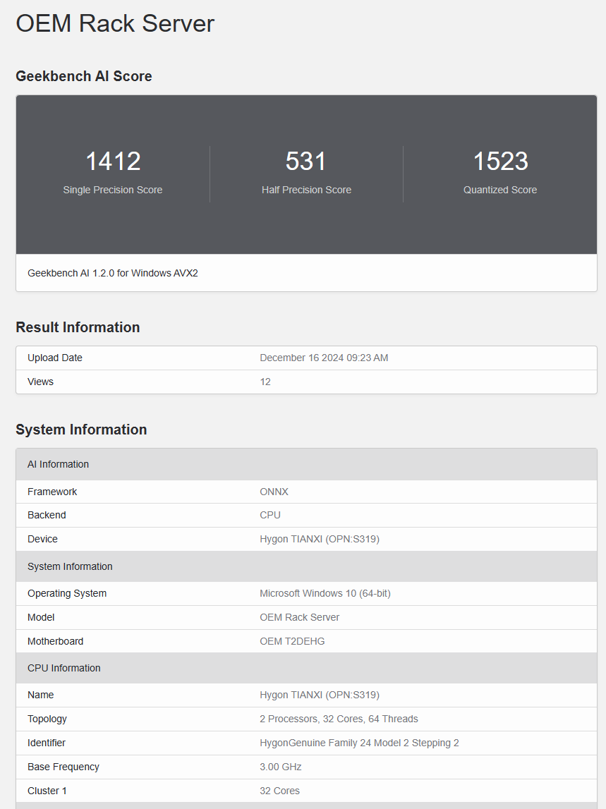 测试项目是GeekBench AI,但明显没有任何优化,参考意义不大,单精度1412分、半精度531分、量化1523分。